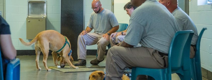 The New Leash on Life program is a collaboration between Mountain Pet Rescue Asheville, Jenny White of Dog-Ed, an Asheville-based certified dog trainer, and Craggy Correctional Center, a medium security prison for men. Four dogs are placed with eight inmate trainers at Craggy for a period of eight to twelve weeks.