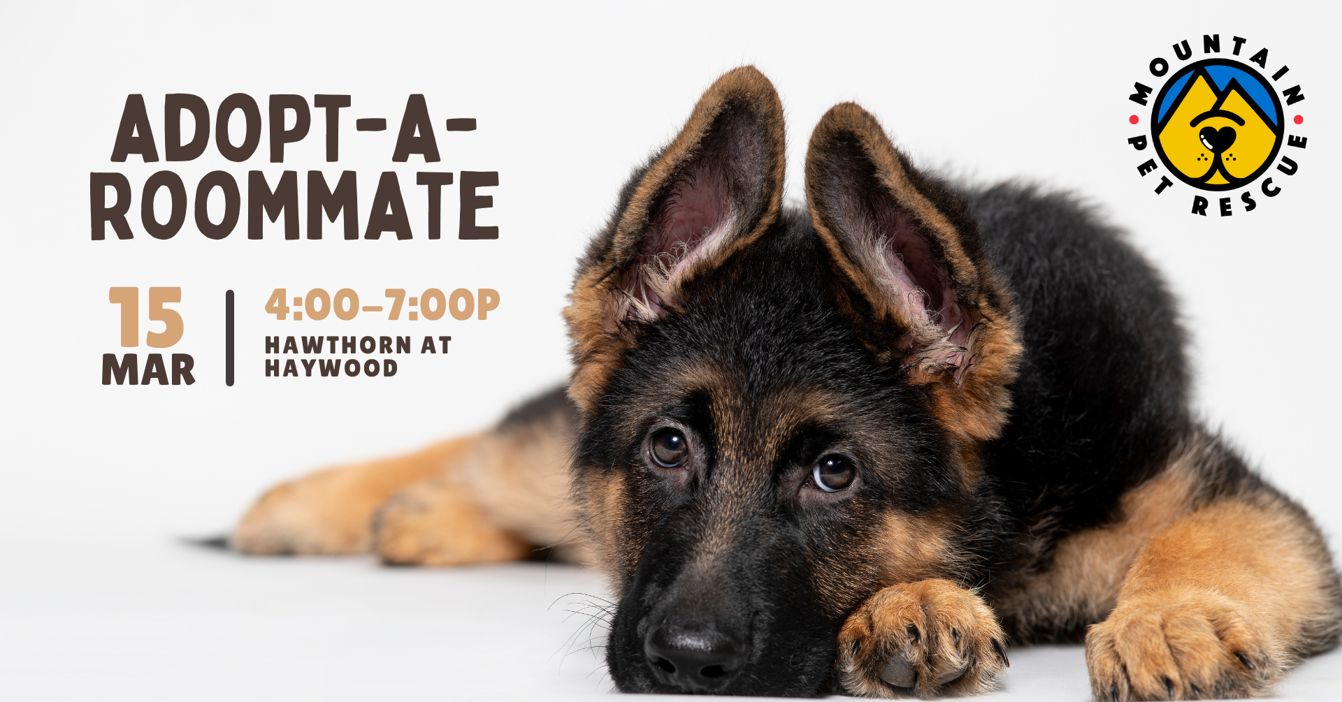 Looking for a roommate that'll listen to your every command? Look no further! Join us at Hawthorn at Haywood on Friday, March 15th, from 4:00-7:00pm to meet your new best furiend!