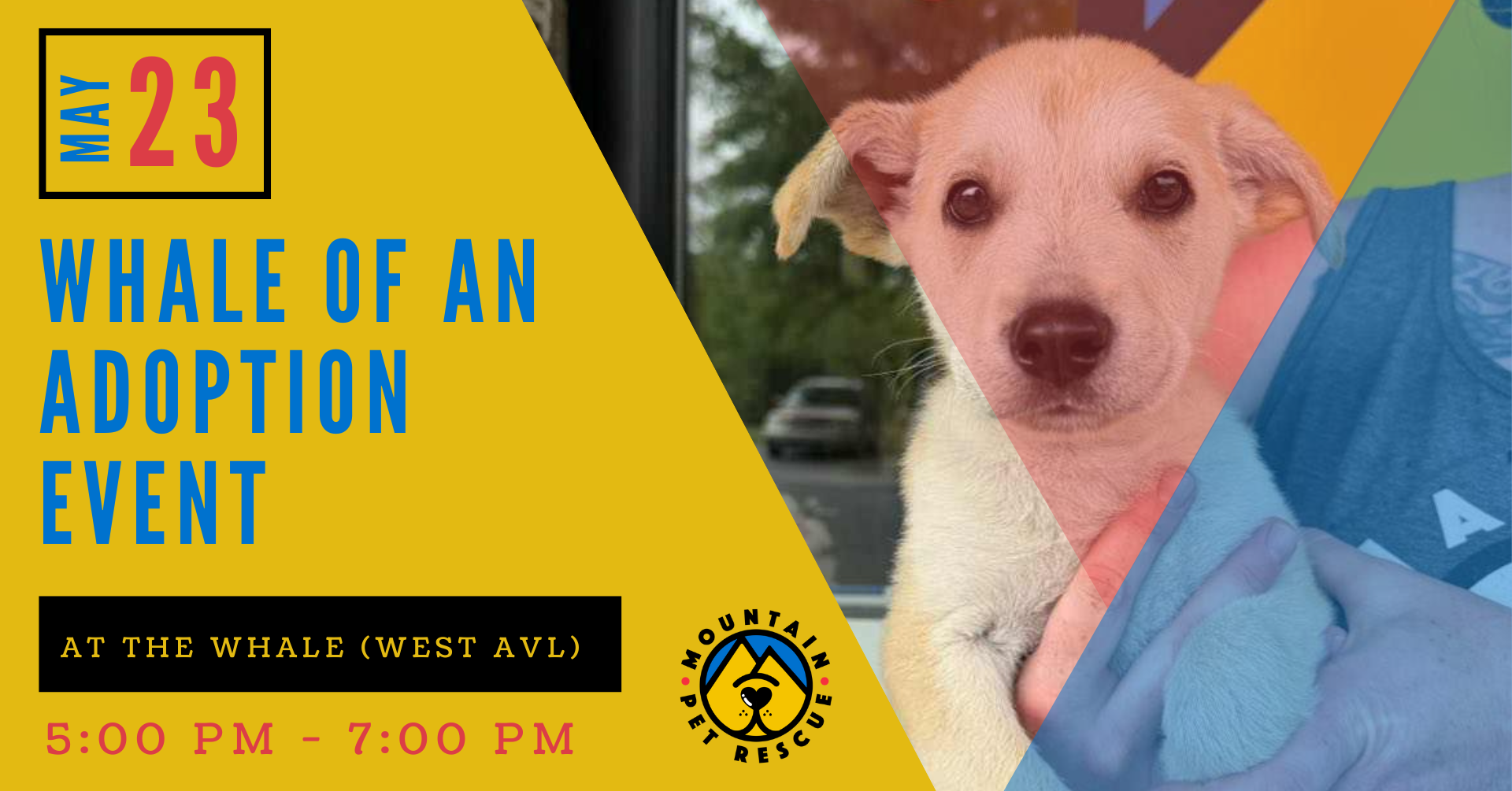 Join us for a Pup Up Adoption Event at The Whale West AVL on Thursday, 5/23, from 5-7pm. Come meet our furry friends and snag some pawsome MPR merch! It’s sure to be a whale of a good time!