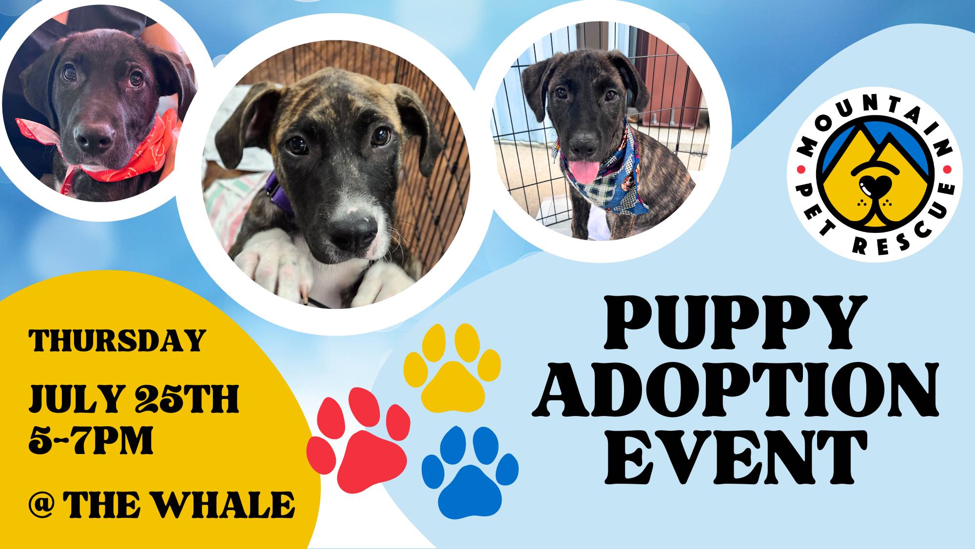 Join us for a Pup Up Adoption Event at The Whale in West Asheville on Thursday, 7/6, from 5p-8p. Come meet our furry friends and snag some pawsome MPR merch! It’s sure to be a whale of a good time!